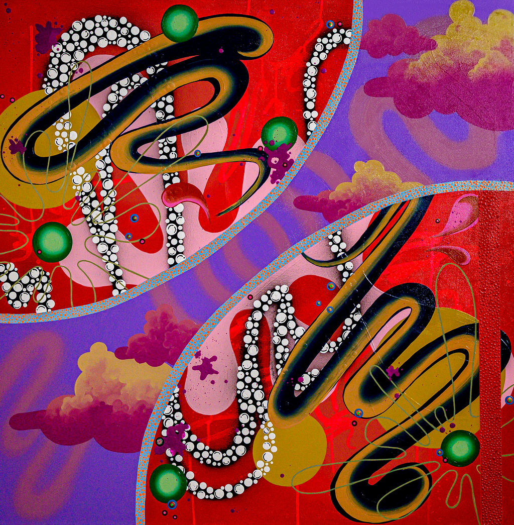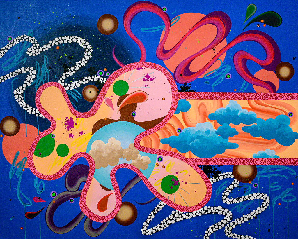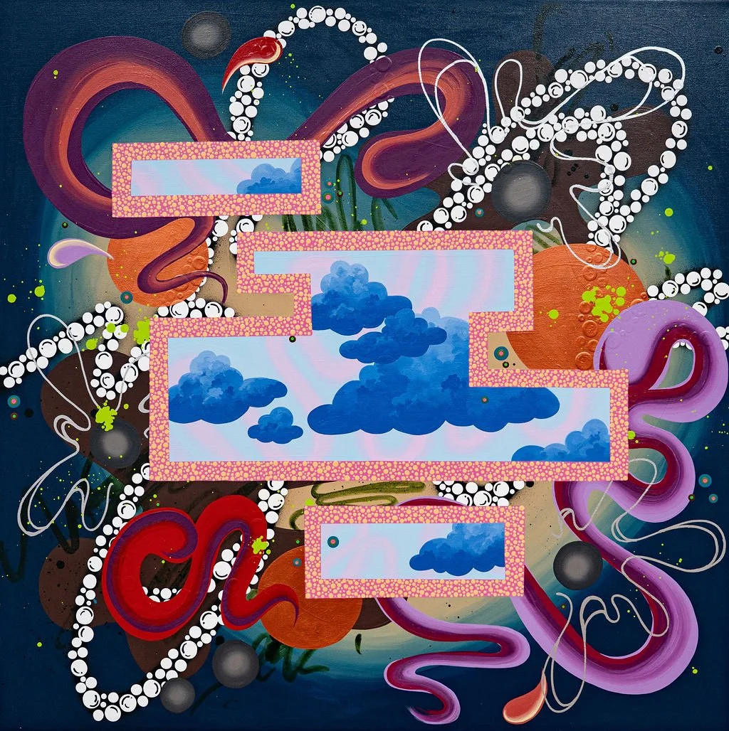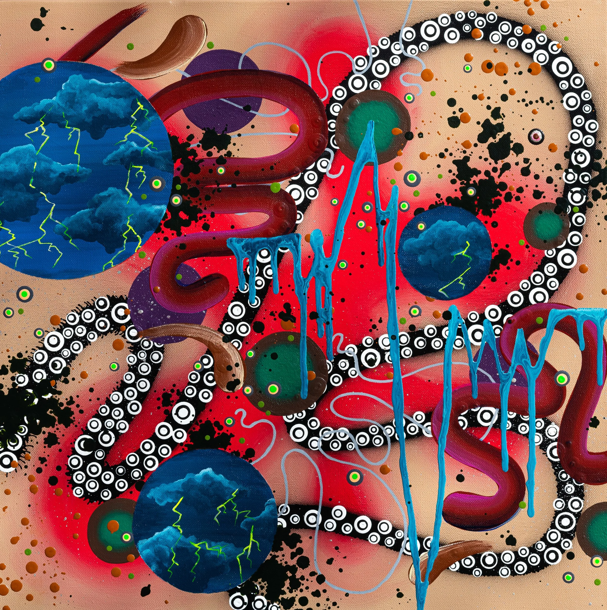 Acrylic paint, acrylic pen, and spray paint on canvas