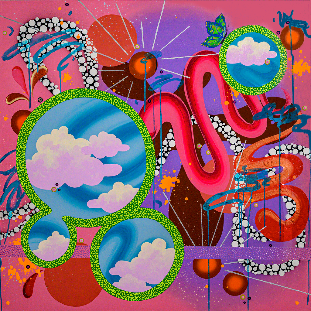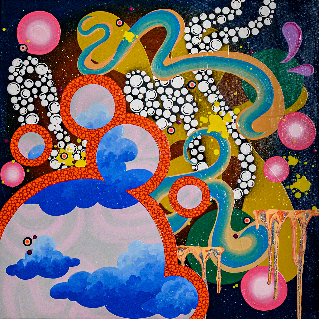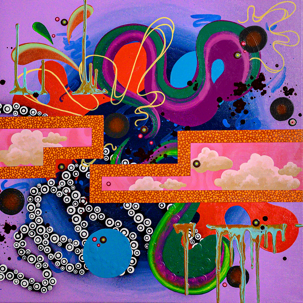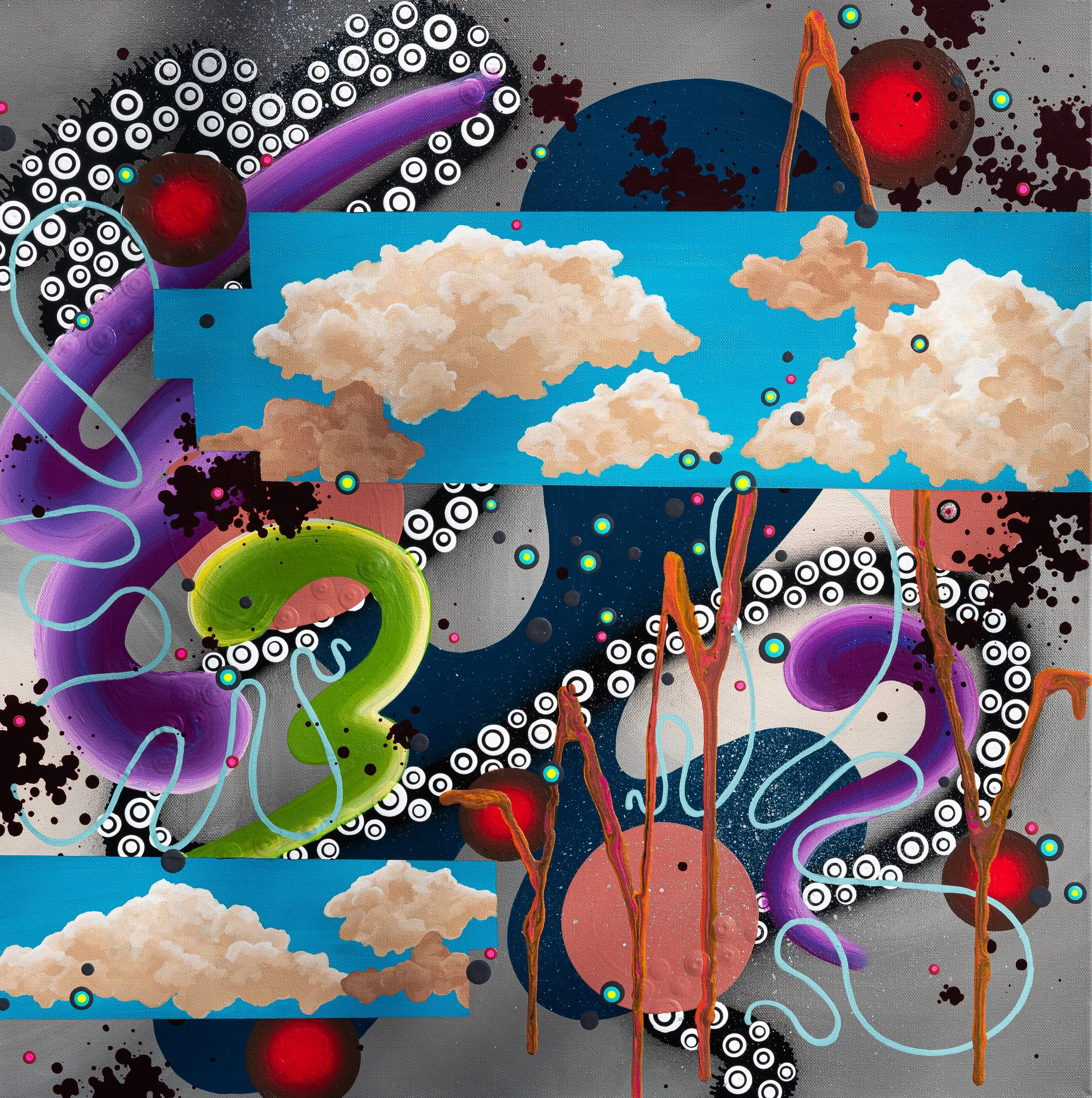 Acrylic paint, acrylic pen, and spray paint on canvas